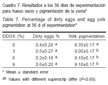 Los resultados de porcentaje de huevos sucios y coloración de la yema se pueden apreciar en el Cuadro 7. Estos resultados indicaron que no hubo diferencia (P>0.05) entre tratamientos en el porcentaje de huevos sucios; sin embargo, hubo una mayor pigmentación en los tratamientos con 3, 6 y 9 % de DDGS respecto al tratamiento testigo (P<0.05).