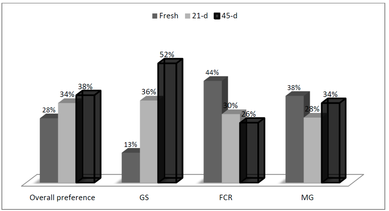 An important component of the present study was to evaluate if the perception of attribute results support panelist preference. The preference results suggest the existence of specific consumers for each cheese type. Preferences differed between scenarios (χ2=8.121; P=0.087), particularly between the GS and FCR panels (Figure 1). The former clearly preferred the 45-day cheese while the latter preferred the fresh cheese; the MG panel exhibited no clear preference.