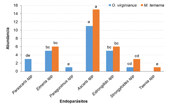 Figure 1 Endoparasite abundance in O. virginianus and M. temama in the El Pochote UMA. Different lowercase letters above the bars indicate significant difference
