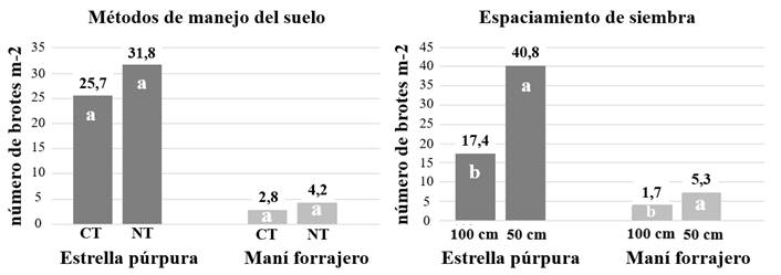 Figura 1 Surgimiento de brotes (número de brotes m-2) de Cynodon nlemfuensis cv. BRS Lua y Arachis pintoi cv. Belmonte 21 días después de la siembra según los métodos de manejo del suelo y el espaciamiento de siembra