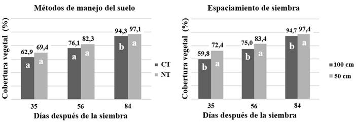 Figura 2 Evolución de la cobertura vegetal (%) durante el periodo de establecimiento de Cynodon nlemfuensis cv. BRS Lua y Arachis pintoi cv. Belmonte afectada por los métodos de manejo del suelo y el espaciamiento de siembra