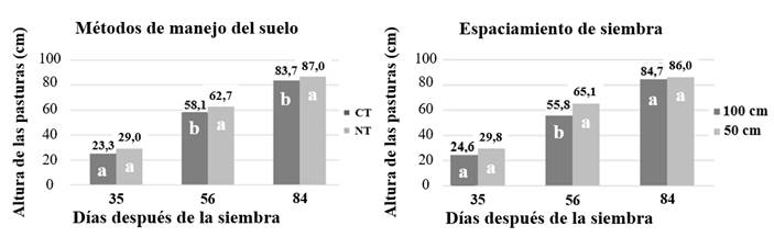 La pastura fue más alta en la SD que en el PC durante el periodo de establecimiento 56 y 84 dds y también, con un espaciamiento de siembra de 50 cm, 56 dds (Figura 3).