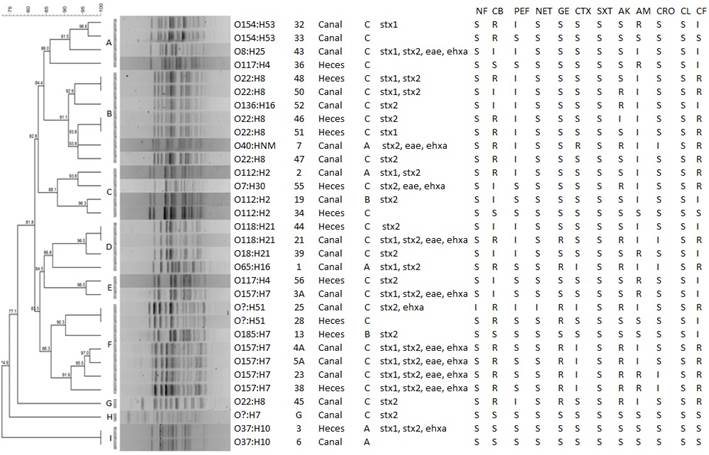 Columnas (izq. a der.): serotipos (O:H), identificación, origen (Heces, Canal), rastro (A, B, C), perfil de virulencia (stx, etcétera) y perfil de resistencia (NF-Nitrofurantoína, CB-Carbencilina, PEF- Pefloxacina, NET-Netilmicina, GE-Gentamicina, CTX-Cefotaxina, STX-Trimetoprima-sulfametoxazol, AK-Amikacina, AM-Ampicilina, CRO-Ceftriaxona, CL-Cloranfenicol y CF-Cefalatoxina; S = susceptible, R = resistente, I = intermedio).