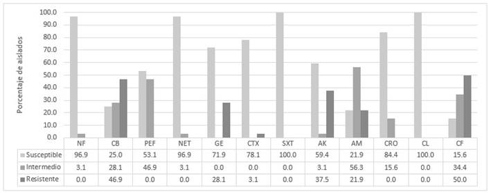 Del total de los 32 aislados probados la mayoría (75 %; 24 de 32) mostraron resistencia a alguno de los antibióticos utilizados. Nueve de los aislados (28.1 %) se clasificaron como MDR, 27 (84.3 %) presentaron un perfil intermedio en al menos un antibiótico y cuatro (12.5 %) fueron sensibles a todos los antimicrobianos. La frecuencia de resistencia varió ampliamente entre los antimicrobianos: 46.9 % (15/32) con CB, 50 % (16/32) con CF, 37.5 % (12/32) con AK, 28.1 % (9/32) con GE, 21.9 % (7/32) con AM y 3.1 % (1/32) con CTX. Varios aislados mostraron un perfil de resistencia intermedio: 56.3 % (18/32) con AM y 46.9 % (15/32) con PEF. Solo el SXT generó sensibilidad en todos los aislados (Figuras 1 y 2).