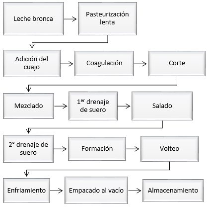 Para la producción de queso a partir de las tres razas se siguió el mismo proceso tecnológico de fabricación que se llevó a cabo en la UPL de la UFRN. Las muestras de leche de las tres razas para la producción de los quesos se sometieron por separado a la pasteurización LTLT (a baja temperatura, por tiempo prolongado 65 °C/30 min). Tras el tratamiento térmico, se enfriaron a 35 °C para la adición de cuajo (renina). Tras la homogeneización de los ingredientes (leche y cuajo), la masa se dejó reposar durante 40 minutos hasta alcanzar el punto de cuajado, antes de cortar. A continuación, se calentó la cuajada, agitándola manualmente, hasta alcanzar los 45 °C. A continuación, se extrajo parcialmente el suero para salar la cuajada. Los procedimientos de pre-prensado y conformación se realizaron en el molde en el cual se prensó posteriormente la cuajada y se la volteó. El proceso de producción del queso se muestra en la Figura 1 y concluye con el envasado de queso al vacío y su almacenamiento a 4 °C en una cámara de refrigeración. La materia prima, los ingredientes y los envases utilizados para la producción de queso se manipularon de acuerdo con las buenas prácticas de fabricación de productos lácteos.