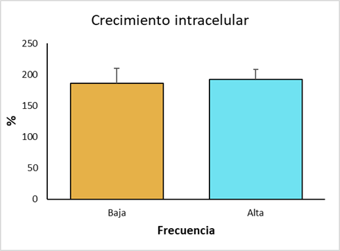 Se realizó una comparación del promedio de UFC por grupo utilizando la prueba t de Student. No se encontraron diferencias (P>0.05) entre los grupos de alta y baja frecuencia ni en fagocitosis (T0) y ni en supervivencia (T1) (Figura 2). Dentro de cada grupo se realizó un análisis estadístico utilizando la prueba t de Student pareada para comparar el promedio de UFC entre la fagocitosis y la supervivencia, en lo cual sí hubo diferencias (P<0.05) (Figura 3).