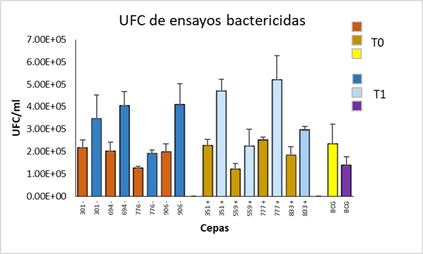 La proporción de fagocitosis fue de alrededor del 63 % para todas las cepas, lo que indica que los macrófagos fagocitaron un número similar de bacterias en cada cepa. Se contaron las unidades formadoras de colonias (UFC) en los ensayos bactericidas que mostraron permisividad de los macrófagos para la replicación de cepas de campo con genotipos de baja frecuencia y mayor UFC/ml en el tiempo de supervivencia (tiempo 1). En la cepa BCG durante el tiempo 1, la cantidad de UFC disminuyó en comparación con el tiempo de fagocitosis (tiempo 0). El mismo escenario se observó con la cepa de genotipo de alta frecuencia en que la cantidad de UFC/ml fue mayor, mientras que en BCG, la cantidad de UFC/ml disminuyó (Figura 1).