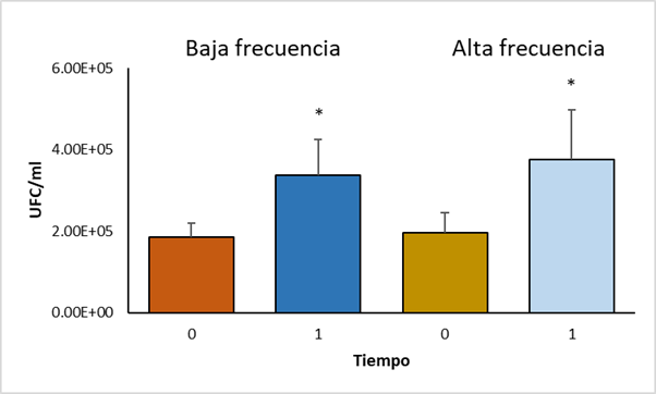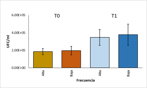 Figura 2 Comparación de los promedios de UFC de cepas de alta y baja frecuencia en el tiempo 0 y en el tiempo 1