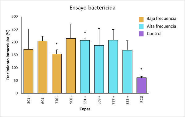En el ensayo de crecimiento intracelular en cepas del genotipo de baja frecuencia, la cepa 906 fue la que presentó la mayor supervivencia (214 %), mientras que la cepa 776 tuvo la más bajo (153 %). El crecimiento intracelular en la cepa 694 fue de (205 %) y el crecimiento en la 301 fue de (172 %) (Figura 4). En los grupos de alta frecuencia, la cepa 777 tuvo el mayor crecimiento (208 %), mientras que el menor correspondió a la 833 (169 %). El crecimiento en la 351 fue de 207 % y el crecimiento de la 559 fue de (187 %). La cepa control (BCG) mostró un crecimiento del 57 %, lo cual valida el ensayo porque confirma la resistencia del fenotipo bovino resistente.