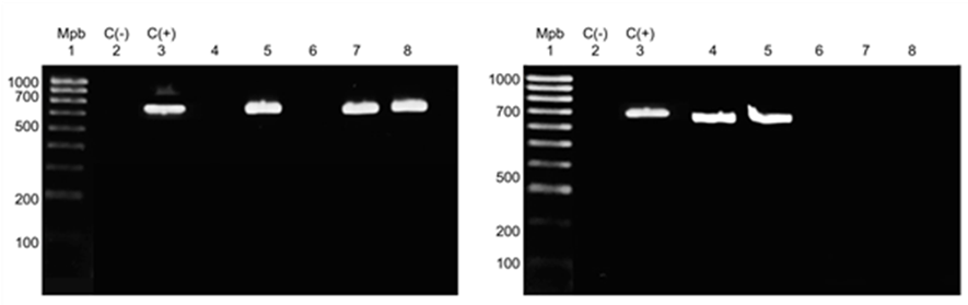 Gel A: carril Mbp, marcador de 100-1,000 pb; carril C(−), testigo negativo; carril C(+), serotipo 2 de S. suis; carriles 1 a 5, muestras de S. suis. Gel B: carril Mbp, marcador de 100-1,000 pb; carril C(−), testigo negativo; carril C(+), serotipo 2 de S. suis; carriles 1 a 8, muestras.