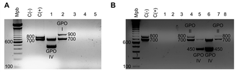 Figura 2 Geles de agarosa (2 %) que muestran los resultados de la PCR de agrupación