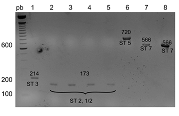Los resultados de la PCR de agrupación se muestran en la Figura 2; las muestras se asignaron a los siguientes grupos en función de los tamaños de los productos de PCR: I, II, IV, V y VI, correspondientes a los tamaños de productos de PCR de 933, 823, 455, 265 y 146 pb, respectivamente. La Figura 3 muestra los resultados de la PCR de tipificación, en la que se determinó el serotipo de cada muestra. Los serotipos 1/2 y 2 se caracterizaron por el mismo tamaño de sus productos de PCR (173 pb); los serotipos 3, 5, 7, 8, 9, 17 y 23 produjeron fragmentos de PCR de 214, 720, 566, 446, 368, 445 y 221 pb, respectivamente. Para diferenciar los serotipos 1/2 y 2, se utilizó la coaglutinación con antisueros específicos.