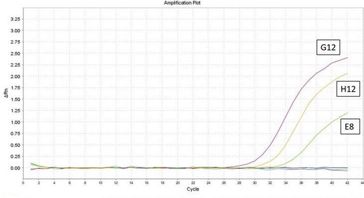 Figure 1 Results of the real-time RT-PCR test for the first positive individual (E8), in the amplification curve, it is observed with a Ct value of 35.21. Opticon Monitor software v.3.0