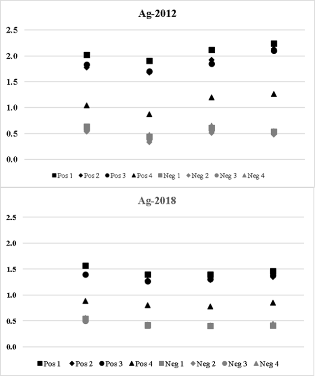 A partir de esta primera comparación, el punto de corte calculado para los sueros negativos probados con Ag-2018 fue de 0.40, mientras que para los mismos sueros probados con Ag-2012 fue de 0.570. El índice medio de positividad para todos los sueros positivos probados con Ag-2018 fue de 3.44, mientras que para los mismos sueros probados con Ag-2012 fue de 2.73 (Figura 2).