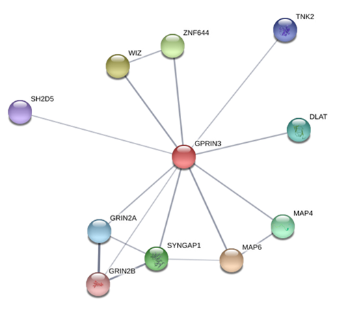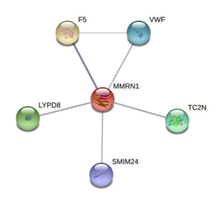 La línea horizontal corresponde a un umbral significativo de P=3× 10-5. Utilizando los genes identificados, se procedió a realizar un análisis IPP consultando la base de datos STRING20. Para MMRN1, el análisis IPP mostró interacciones con genes como F5 y VWF, involucrados en el proceso de coagulación (Figura 2), en la base de datos Gene Ontology (GO), MMRN1 está anotado con el término GO: 0007596, llamado coagulación sanguínea. Para GPRIN3, el motor de búsqueda mostró interacciones entre el proceso de fosforilación codificado por los genes LOC790121 y OR6N1 con proteínas que están involucradas principalmente en el ensamblaje citoesquelético y la modulación de la neurotransmisión (Figura 3). La base de datos GO mostró que este gen fue anotado con el término GO:0031175, proceso biológico llamado desarrollo de proyección neuronal, progresión de una proyección neuronal desde su formación hasta la estructura madura.