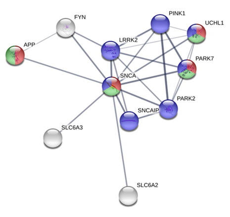 El análisis de IPP indicó que SNCA interactúa con las proteínas APP (proteína precursora de β-amiloide), PARK7 (deglicasa asociada al parkinsonismo) y UCHL1 (ubiquitina C-terminal hidrolasa L1) (P= 5.88e-06) involucradas en el comportamiento locomotor adulto. Además, el término GO:0008344 revela fuertes interacciones de SNCA con genes pertenecientes a una familia de transportadores de neurotransmisores (SLC6A) en la red (Figura 4).
