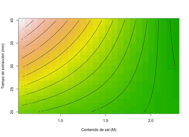 Para elegir los mejores parámetros operativos, siempre se deben seleccionar un tiempo de extracción alto y un contenido de sal bajo. Dado que los otros dos factores no son significativos, se puede trabajar a cualquier temperatura de equilibrio y temperatura de extracción; por lo tanto, se decidió trabajar a bajas temperaturas de equilibrio y extracción por razones económicas.