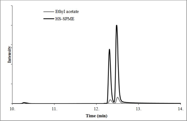 La Figura 1 muestra la comparación de cromatogramas SIM utilizando la extracción HS-SPME y Soxhlet con disolvente de acetato de etilo. Para la técnica HS-SPME, la sensibilidad aumenta casi nueve veces en comparación con la técnica de extracción con disolvente, incluso utilizando menos cantidad de muestra durante el proceso de microextracción, lo que demuestra la efectividad y ventaja de la metodología de HS-SPME.