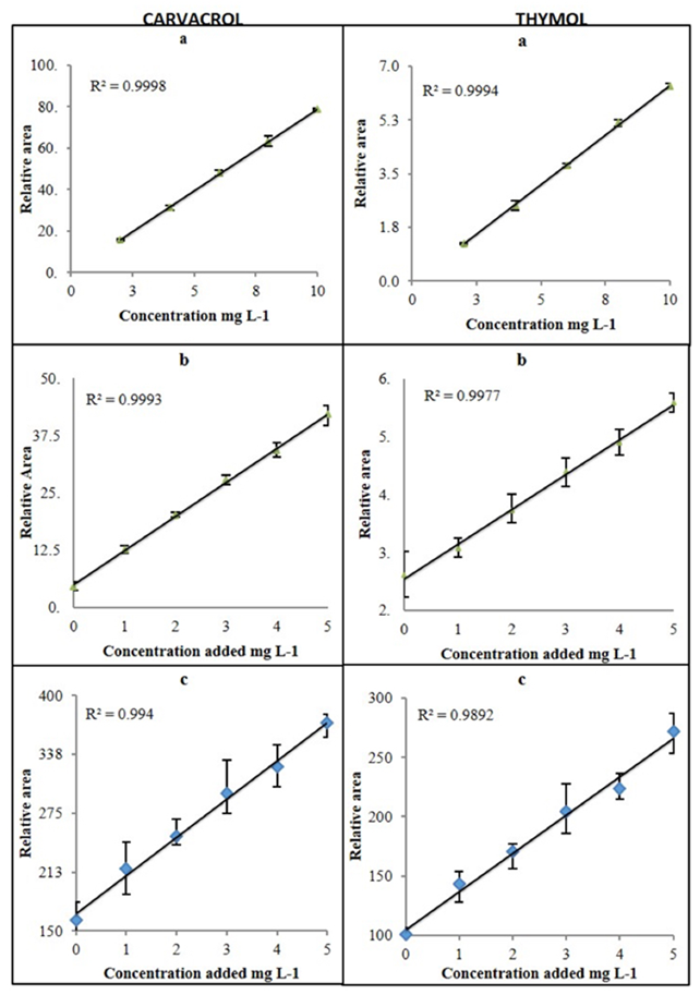En la Figura 3 se pueden observar las curvas de calibración para: (a) el uso de timol y carvacrol como estándares externos para la técnica de extracción Soxhlet; (b) el uso de NPIP como estándar añadido para la técnica de extracción Soxhlet; y (c) el uso de NPIP como estándar añadido para la técnica HS-SPME. No es posible utilizar estándares externos para la técnica SPME. Cabe destacar que la señal del área relativa es del orden de decenas para el carvacrol, ya sea con estándar externo o estándar de adición, mientras que la señal del área relativa para el timol está en el orden de unidades para estándares externos y de adición. Pero para HS-SPME la señal del área relativa es del orden de cientos tanto para el timol como para el carvacrol, lo que confirma nuevamente el aumento de la sensibilidad de un orden de magnitud (dos órdenes para el timol) de esta técnica.