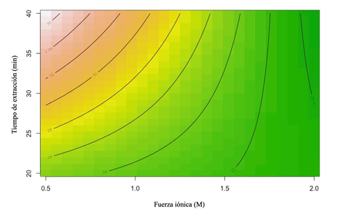 El Cuadro 3 muestra el análisis de la varianza evaluado solo con los factores significativos del DOE, es decir, los factores de fuerza iónica, tiempo de extracción e interacción fuerza iónica-tiempo de extracción.