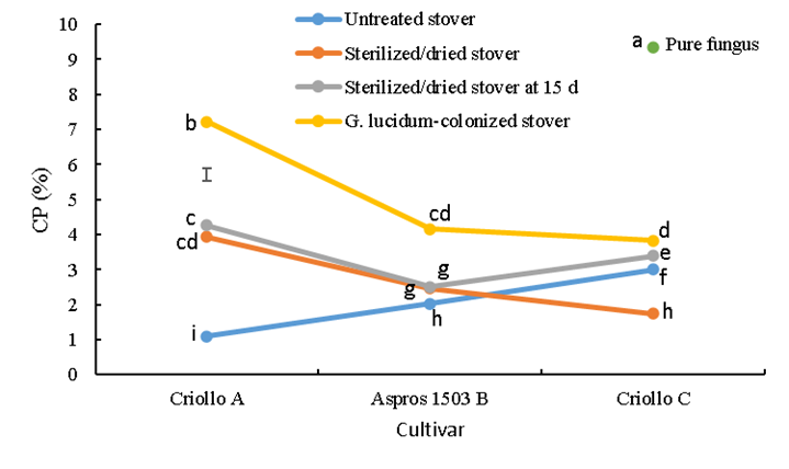 Figure 5 Crude protein (CP) content of the three evaluated corn stovers in four treatments, including colonization with the white rot fungus Ganoderma lucidum