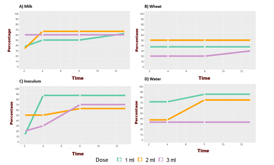 Figure 1 Percentage of seroconversion of the four different inoculum vehicles (water, direct, milk, and wheat) at three different doses, at four different times after inoculum administration