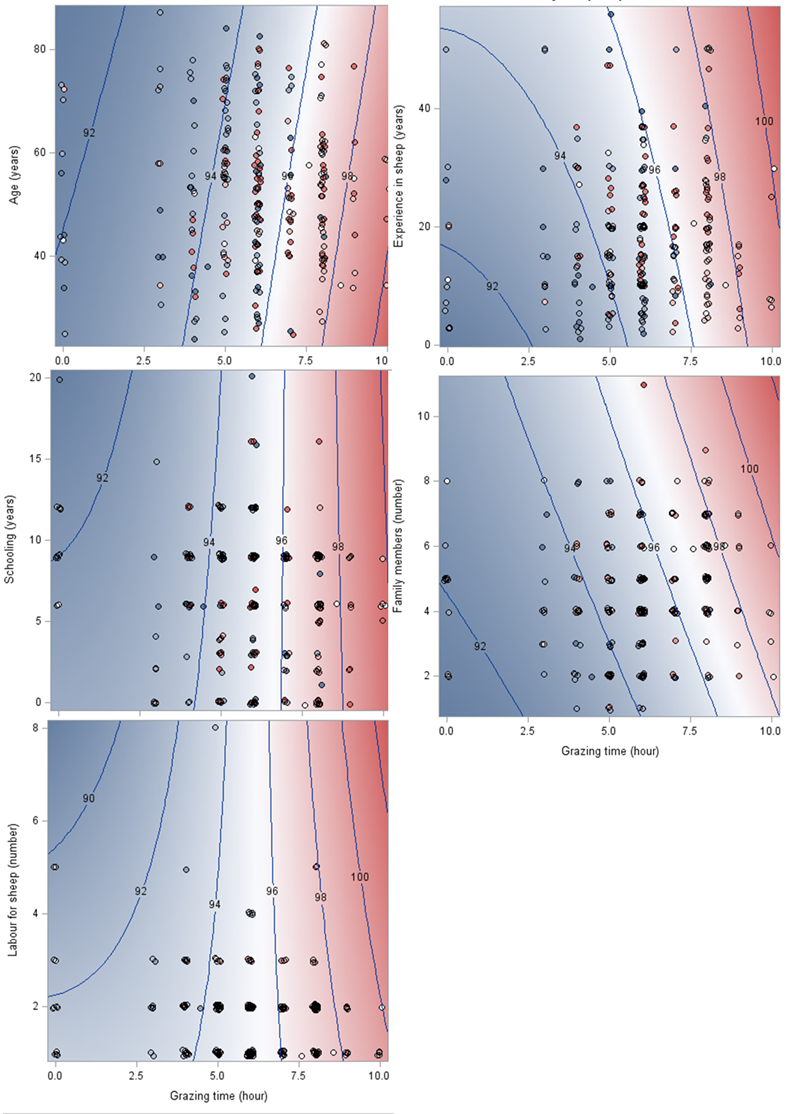 The results of the response surface regression models are presented in Figure 1. In the age of the head and members of the family, it is observed that the surfaces of the slopes estimated for grazing percentage are parallel, which indicates the absence of a significant relationship with grazing time. Meanwhile, in the experience, schooling and days of work spent on sheep, the surfaces of the estimated curves do not have a single optimum, which indicates that they have slopes with a significant difference in the fit for grazing percentage (P<0.05).
