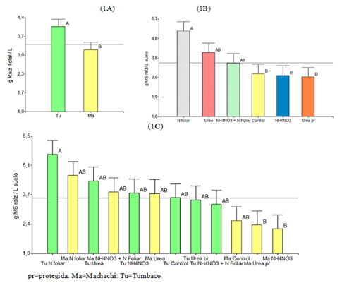 Figura 1 Efecto de fuentes de fertilizantes nitrogenados sobre la Biomasa radicular (g MS raíces L-1): (1A) efecto de localidades Machachi y Tumbaco; (1B) efecto de los tratamientos de las fuentes evaluadas; (1C) interacción localidad x tratamientos