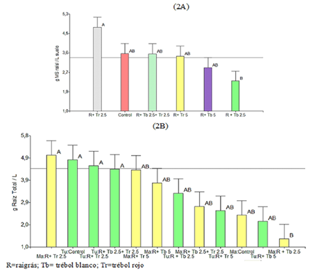 Figura 2 Efecto de las mezclas raigrás con trébol blanco o rojo sobre la biomasa radicular (g MS raíces L-1) (2A) diferencias entre mezclas; (2B) interacción localidad x mezcla