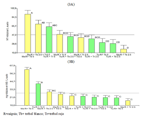 Figura 3 (3A) Efecto de la mezcla de raigrás con trébol blanco o rojo sobre el número de nódulos (N° nódulos/ L suelo) en la interacción localidad x mezcla. (3B) Efecto de la mezcla de raigrás con trébol blanco o rojo sobre el peso de nódulos (mg nódulos en MS/ L suelo) y de la interacción localidad x mezcla