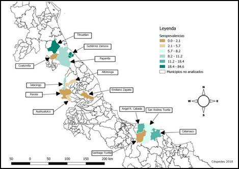 Figura 1 Localización y seropositividad hacia Maedi-Visna en ovejas de municipios probados en el estado de Veracruz, México
