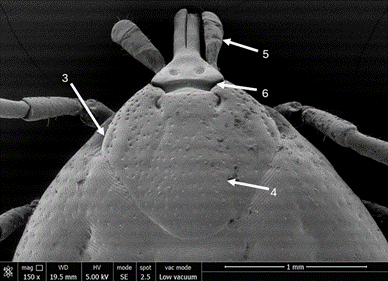 *3) Presencia de ojos, 4) Escudo con numerosas puntuaciones, 5) Palpos robustos y cortos, 6) Base del gnatosoma ancho y extendido lateralmente.