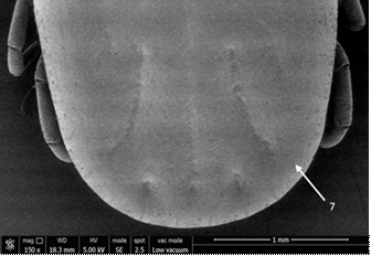 La identificación de los especímenes se realizó utilizando las claves taxonómicas morfológicas establecidas en 201111, donde se describen las especies pertenecientes al género Amblyomma en México. Para una descripción detallada de las estructuras morfológicas, se utilizó microscopía electrónica de barrido, siguiendo un procedimiento modificado15,16. Esto incluyó una serie de pasos como limpieza con pinzas y pinceles, deshidratación con etanol, y secado con una secadora de punto crítico. Una vez preparadas, las garrapatas fueron recubiertas con oro, y luego analizadas utilizando un microscopio electrónico de barrido de emisión de campo FEI Quanta 250 FEG.