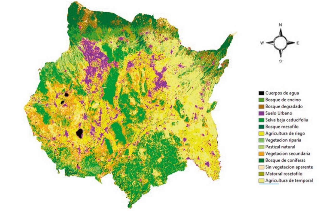 Cuerpos de agua = Water bodies; Bosque de encino = Oak forest; Bosque degradado = Degraded forests; Suelo urbano = Urban soil; Selva baja caducifolia = Low deciduos forest; Bosque mesófilo = Mesophilic forest; Agricultura de riego = Irrigated agriculture; Vegetación riparia = Riparian vegetation; Pastizal natural = Natural pastures; Vegetación secundaria = Secondary vegetation; Bosque de coníferas = Conifer forest; Sin vegetación aparente = Without apparent vegetation; Matorral rosetófilo = Rosetophile scrub; Agricultura de temporal = Rain-fed agricultura.