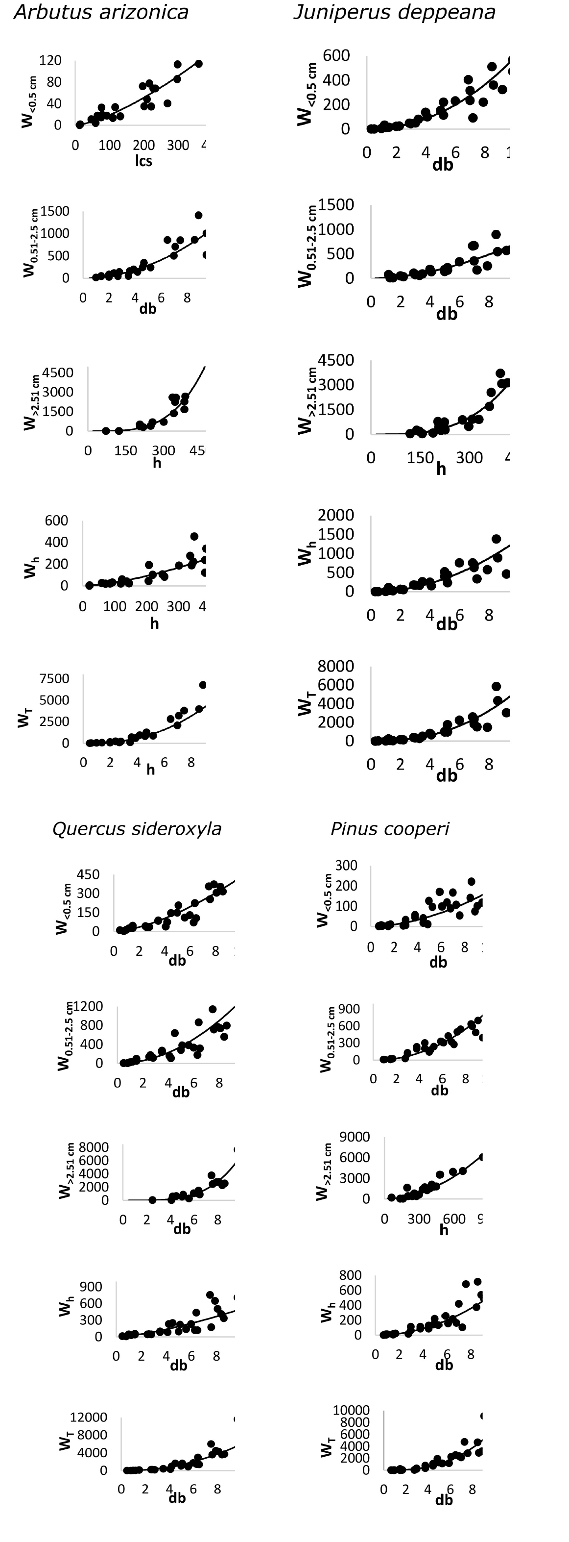 Figure 1 shows the graphic representation of the values of the biomass of fractions by component against the independent variable that had the greatest influence on the allometric equations for Arbutus arizonica, Juniperus deppeana sideroxyla, Quercus and Pinus cooperi.