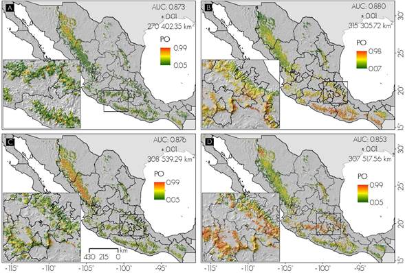 Borers. The states with the largest area of potential distribution for borers (probability ≥ 0.85) were Chihuahua (23 %), Durango (16.9 %) and Oaxaca (10.2 %) of the 270 402.35 km2 (Figure 1), while in San Pedro Mártir Sierra (Baja California) where Díaz (1988) has described borers of the genus Cydia on Pinus jeffreyi Balf. and P. ponderosa Douglas ex C. Lawson, the model predicts probability of presence up to 0.88. Likewise, Galindo et al. (2011) made the first record of the Megastimus genus which causes significant damage to seeds of Abies religiosa (Kunth) Schltdl. et Cham. and A. hickeli Flous & Gaussen in Cofre de Perote (Veracruz), where the probability of presence of 0.51 is predicted. This suggests that borers may exist in the sites indicated by the model, while the fact that they have not been recorded or described only indicates the deficiency in field studies. Some areas of discontinuous distribution are also observed in the Trans-Mexican Volcanic Axis, as in Chiapas, Coahuila and Nuevo León (Figure 1A).