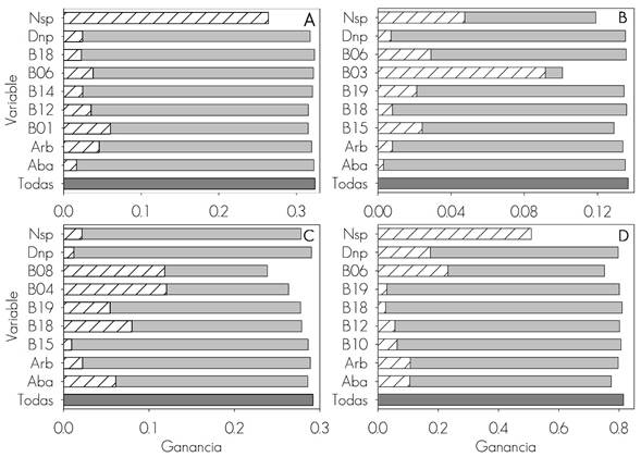 Figure 2 Importance of the variables (Jackknife test) in models of the potential distribution of pests that affect the conifer forest of Mexico.