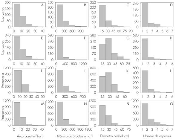 A – D = Borers; E – H = Defoliators; I – L = Barking beetles; M – O = Mistletoe Frecuencia = Frequency; Área basal = Basimetric area; Número de árboles = Number of trees; Diámetro normal = Normal diameter; Número de especies = Number of species