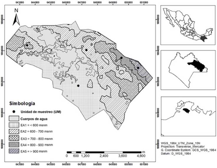 Simbología = Simbology; Unidad de muestro = Sampling unit; Cuerpos de agua = Bodies of water; EA = AS
