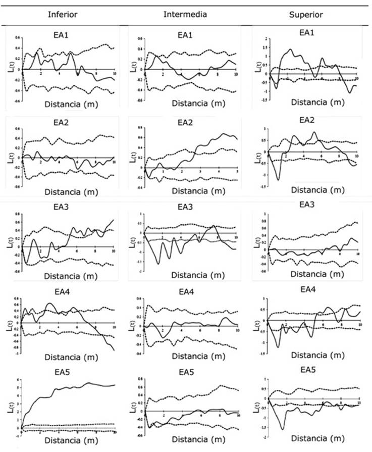 In general, the lower height category had a clumped pattern, with variation at different distances and altitude strata (Figure 2). AS1 and 4 have a clumped distribution at distances of 1 to 6 m, and a uniform distribution at distances of more than 7 m; AS2 had a random behavior, and the distribution of AS3 was uniform at distances of 1 to 2 m, and a clumped distribution at distances of 3 to 10 m (Figure 2). AS5 had a clumped distribution at all the distances.