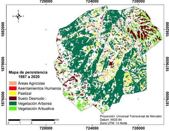 The dynamics of change were determined with the land use and vegetation maps for 1987, 2008 and 2020, using the Land Change Modeler for Ecological Sustainability module of the IDRISI Selva® software. The analysis was carried out in order to observe the dynamics of change in two periods from 1987 to 2008 and from 2008 to 2020, for an overall analysis period of 33 years.
