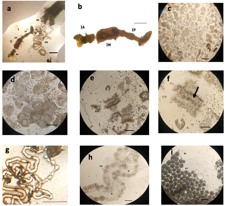 Salivary glands (Figure 1g) were observed in a large proportion, flanking the larval alimentary canal; they are a pair of elongated transparent ducts that are surrounded by a large number of granulated cells.