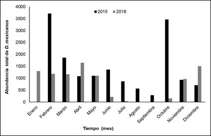 The pattern of climatic variables, such as MMT, MMP and MAI partially explain the occurrence of a higher or lower abundance of D. mexicanus throughout 2015 and 2016. For example, the temperature range in the study area shows a pattern in the MMT throughout the year, in which it is observed to decrease from November to January by 14 °C (-/+1 °C); then, the temperature increases gradually from February onwards, reaching 20 °C (-/+2 °C) in April and May; from June to September, the average temperature decreases to 19 °C (-/+2 °C), and the rainy season begins; the temperature decreases from September onwards, reaching 14 °C (-/+1) in December (Figure 2A).