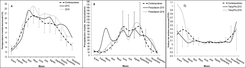 Figure 2 Monthly temperature (A); Monthly precipitation (B); Monthly aridity index (C) in 2015, 2016 and contemporary data (1963-1993) in the pine forest of the state of Hidalgo.