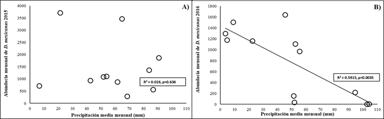 The correlation results exhibited a low association of D. mexicanus abundance with the mean minimum temperature in 2015 (r = -0.51), and with the mean minimum temperature (r = -0.63), the mean minimum precipitation (r = -0.77), the aridity index (r = 0.52) and the SPI (r = 0.61 in 2016 (Table 2). On the other hand, there is a functional relationship between the monthly abundance and the mean monthly precipitation for the year 2016 (R 2 = 0.59); while, for 2015, no relationship was observed (Figure 3A, Figure 3B; Table 2).