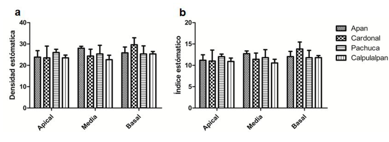 Densidad estomática = Stomatal density; Índice estomático = Stomatal index; Apical = Apical; Media = Middle; Basal =Base.