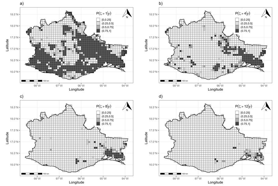 The second cluster goes from the southwest (adjoining the state of Guerrero) to the southeast of the state, an area that comprises the Sierra Madre del Sur. This region is made up of dry, warm forests and temperate mountain ranges, and probably high values of the main spatial effect are also due to the anthropogenic impacts. Both clusters identified in this study were also identified by Zúñiga-Vásquez et al. (2017), integrating data for the whole Mexican territory.