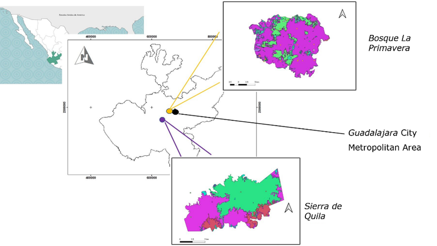 Field work was carried out in Bosque La Primavera (BLP) and Sierra de Quila (SQ) Flora and Fauna Protection Areas (APFF) in the state of Jalisco. BLP is located in the Sierra La Primavera, west of the Guadalajara city metropolitan area (Figure 1). It was decreed on March 6, 1980 with 30 500 ha, between 20º32' to 20º44' N and 103º28' to 103º42' W. Its altitudinal range is 1 400 to 2 200 m, in Tala, Zapopan and Tlajomulco municipalities, Jalisco. The predominant climate is temperate sub-humid and semi-warm sub-humid (García, 2004). The average annual precipitation fluctuates between 800 and 1 000 mm, and the average annual temperature is 20 °C. The predominant type of vegetation is mixed pine-oak or oak-pine forests, although there are also areas of gallery forest and low deciduous forest (Gallegos et al., 2014).