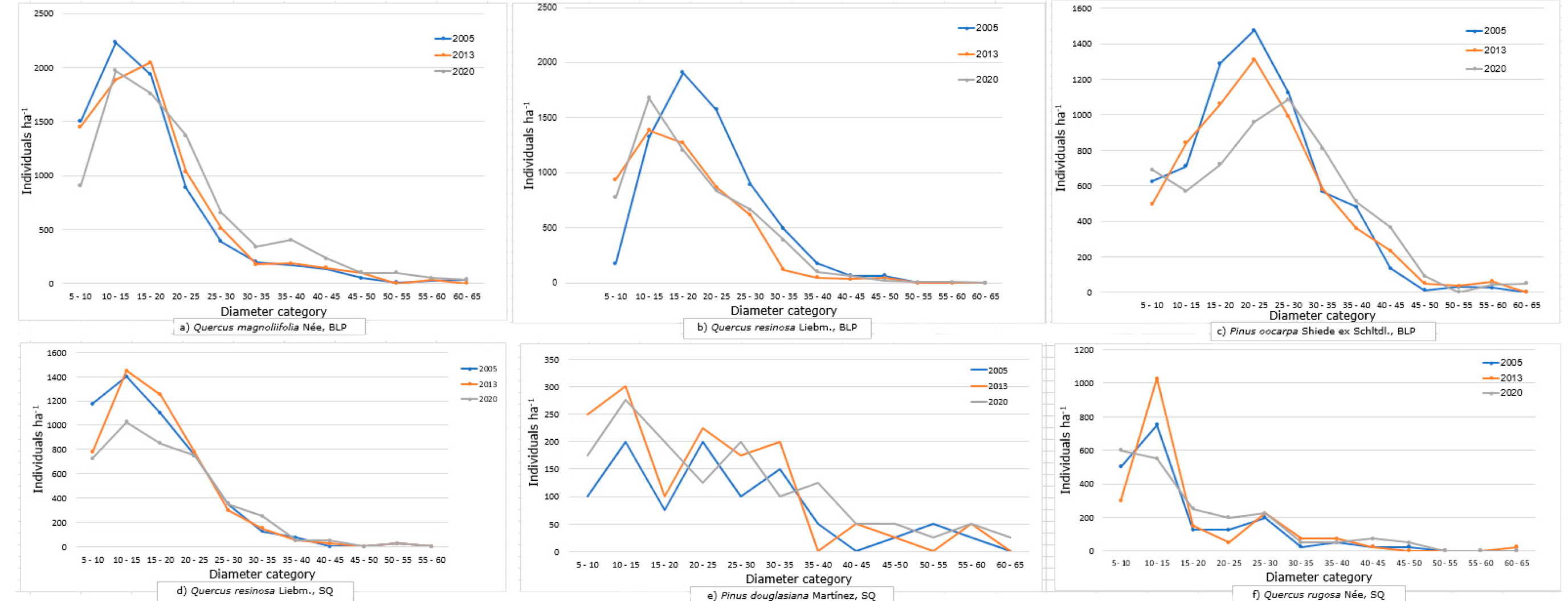 In the case of P. oocarpa in BLP, the diameter category with the most individuals went from 10-15 cm in the years 2005 and 2013 to the 25-30 cm class in 2020 (Figure 2c). This trend coincided with a decrease in the number of individuals of the diameter category 10-15 from 1 310 individuals ha-1 in 2013 to 960 individuals ha-1 in 2020. P. douglasiana in SQ had a dispersed structure due to the fact that there is a decrease of individuals for the diameter categories 15-20, 25-30 and 30-35 cm dn in the different periods (Figure 2e).