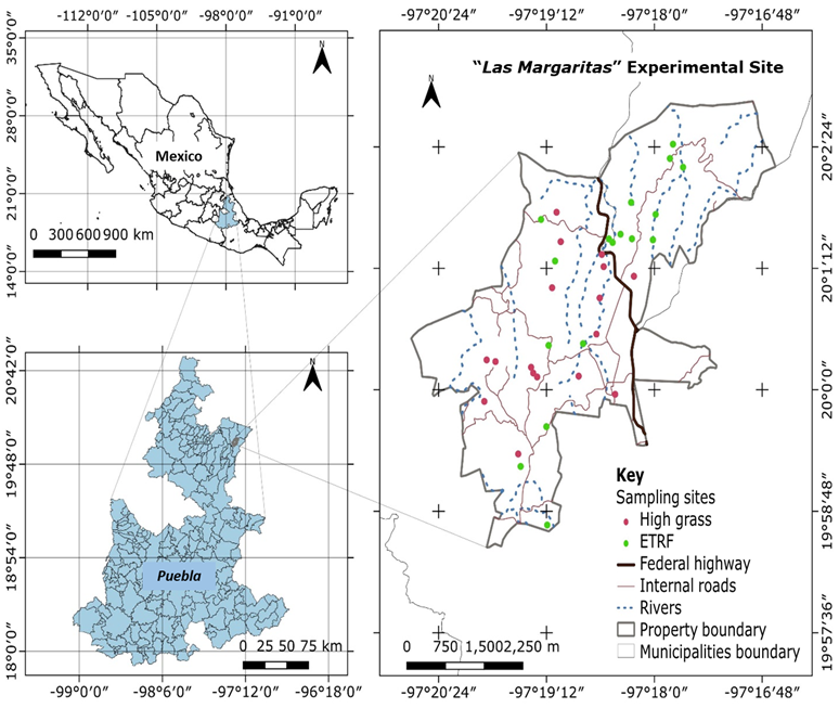 The study was conducted in the tropical forests of the Las Margaritas Experimental Site, located in the northwest of the state of Puebla between Hueytamalco and San José Acateno municipalities (Figure 1); this site has 2 523 ha of surface area, 84 % of which is covered by Evergreen tropical rain forest and high grass.